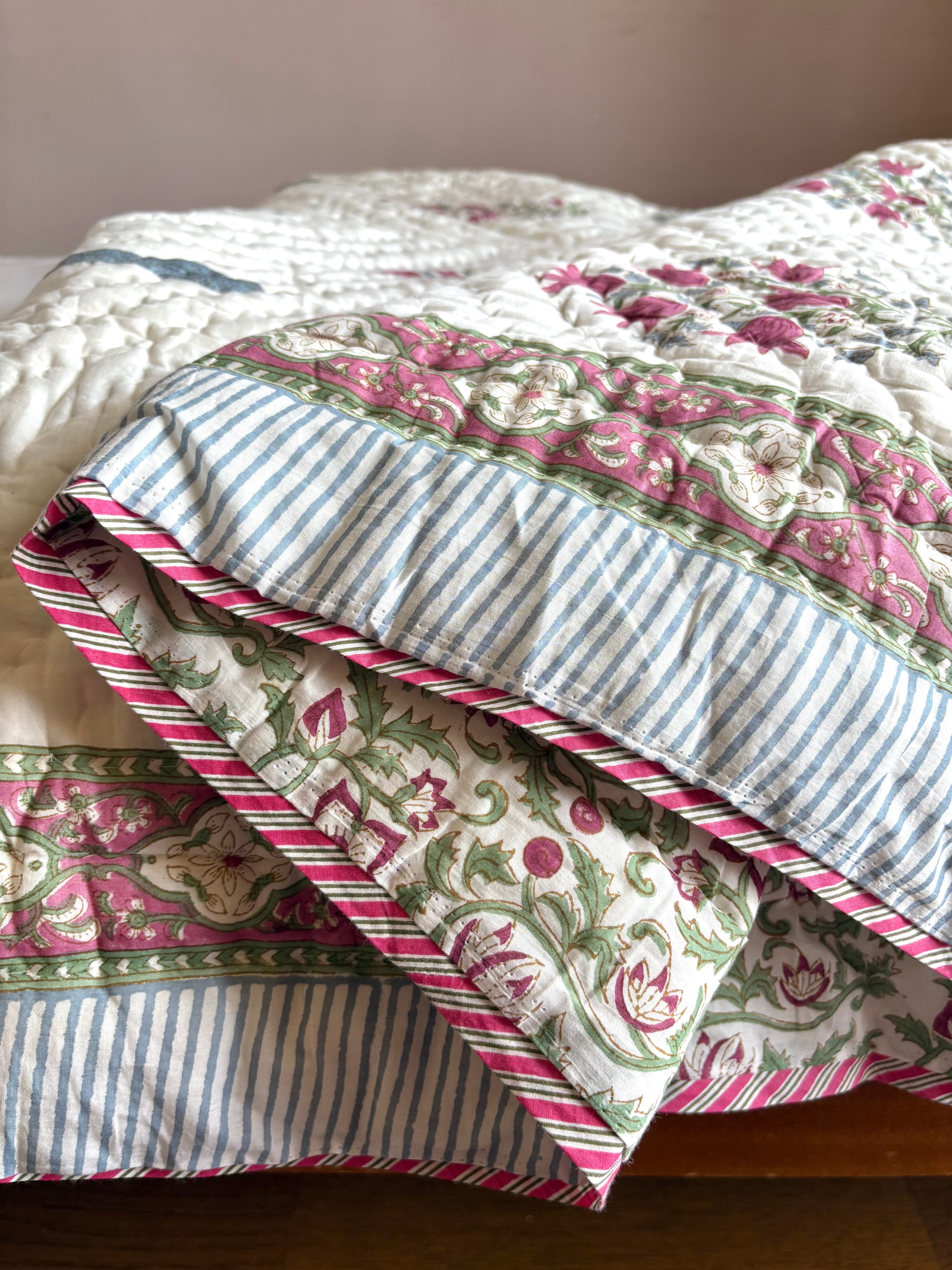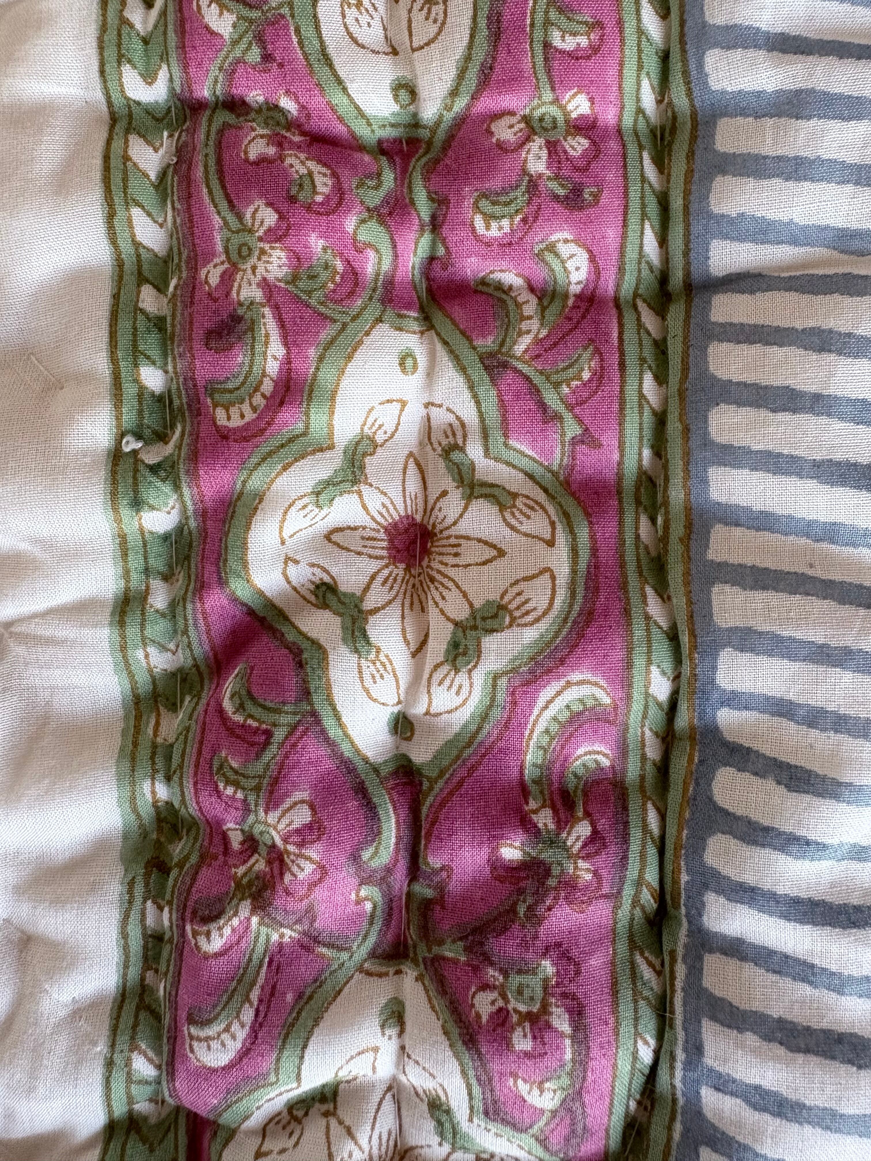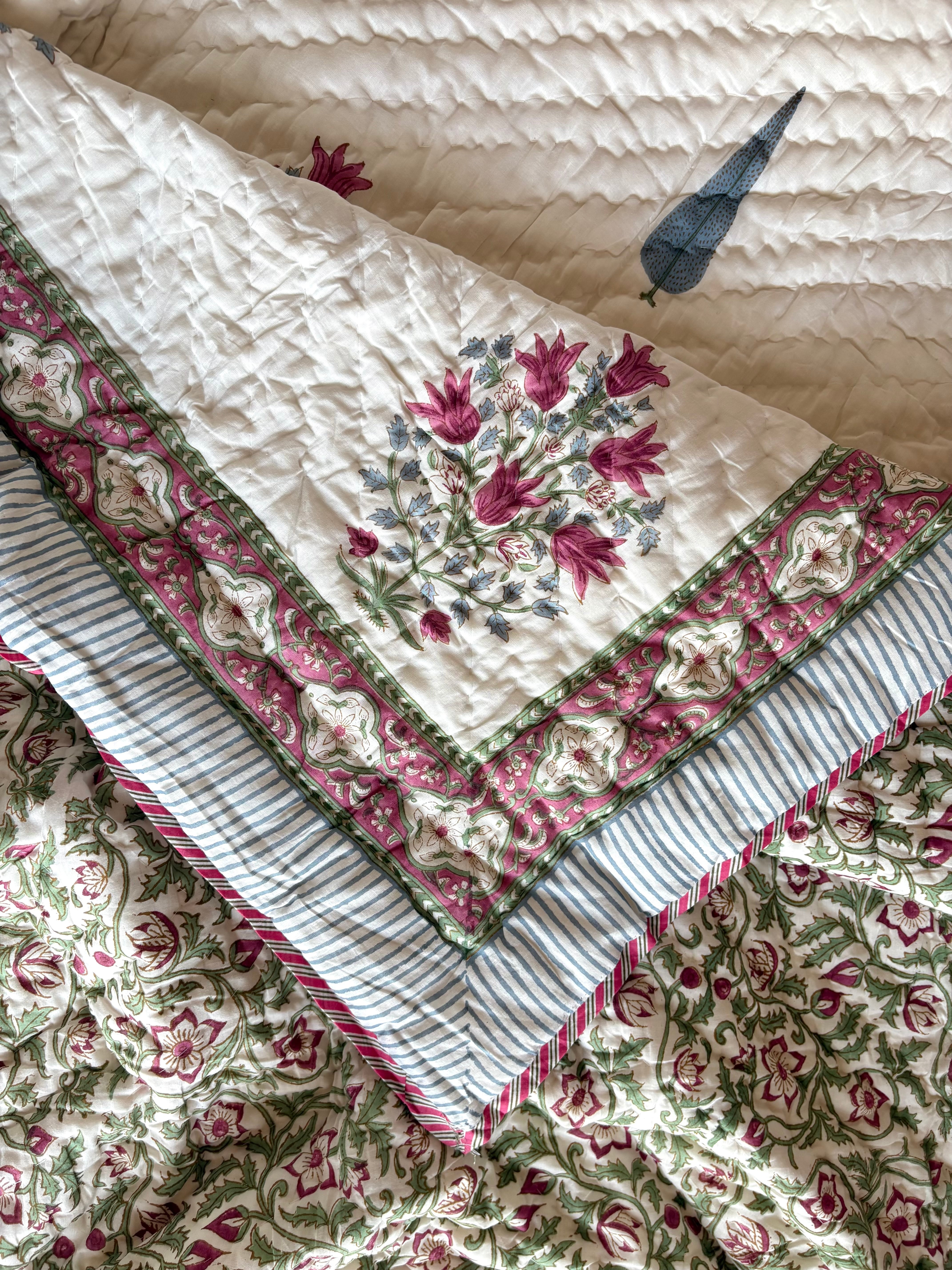 インド・ラジャスタン州ジャイプール伝統の木版染ハンドキルトの肌布団です。