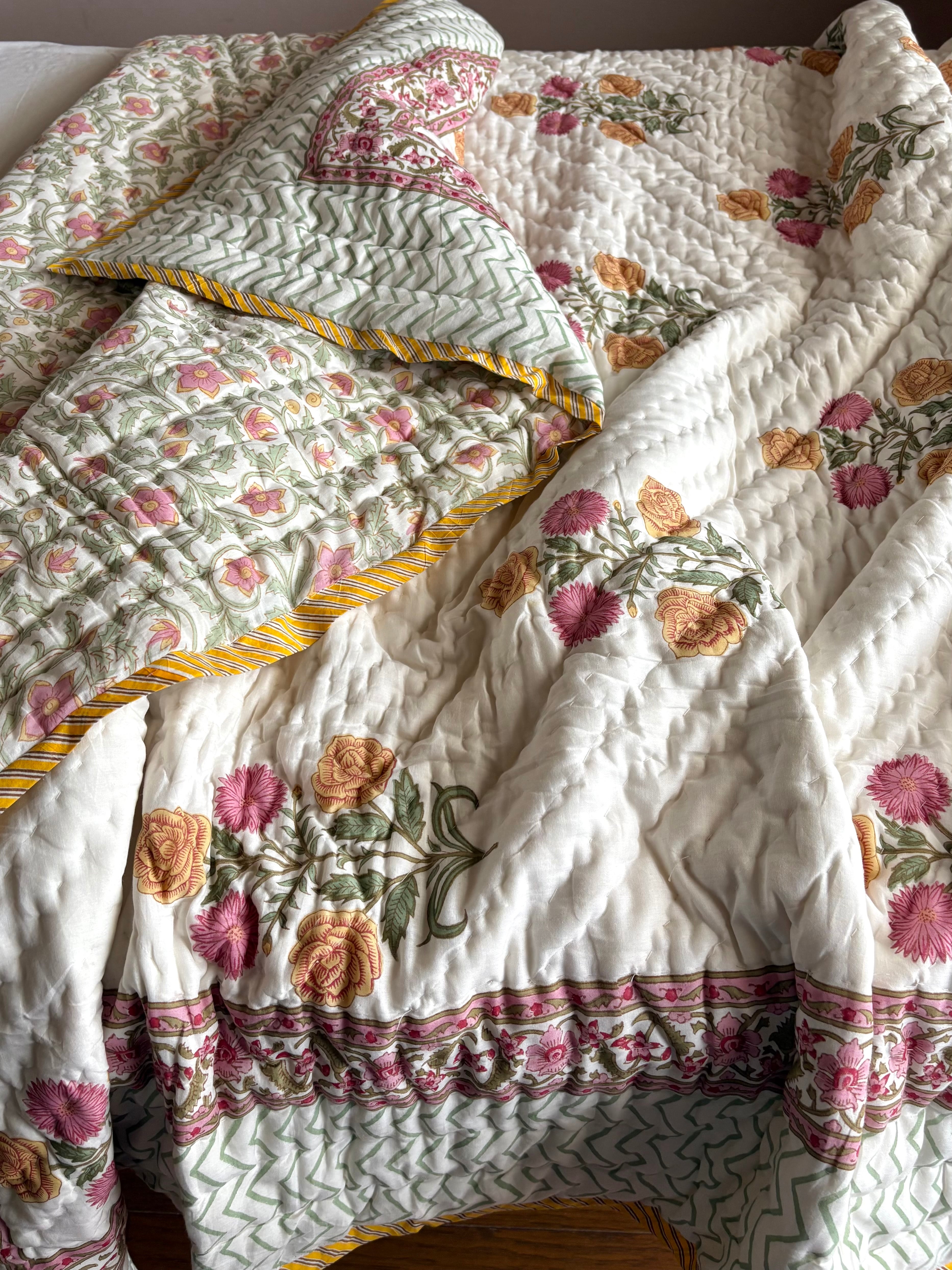 インド・ラジャスタン州ジャイプール伝統の木版染ハンドキルトの肌布団です。