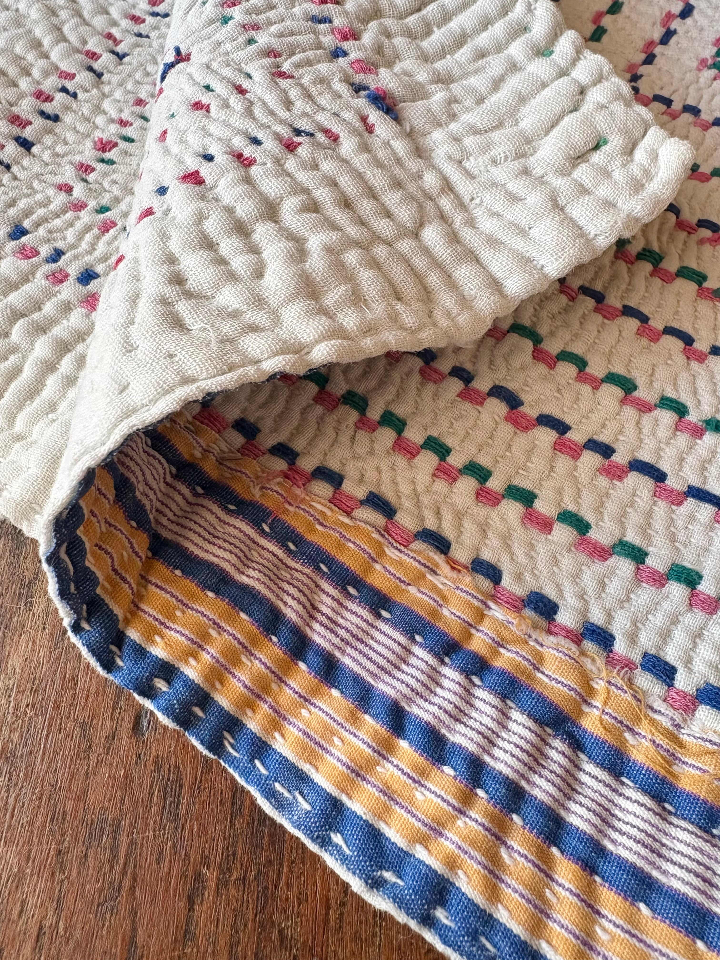 古くなったサリーなどの生地を何枚か重ねてひと針ひと針刺し子を施した布です。