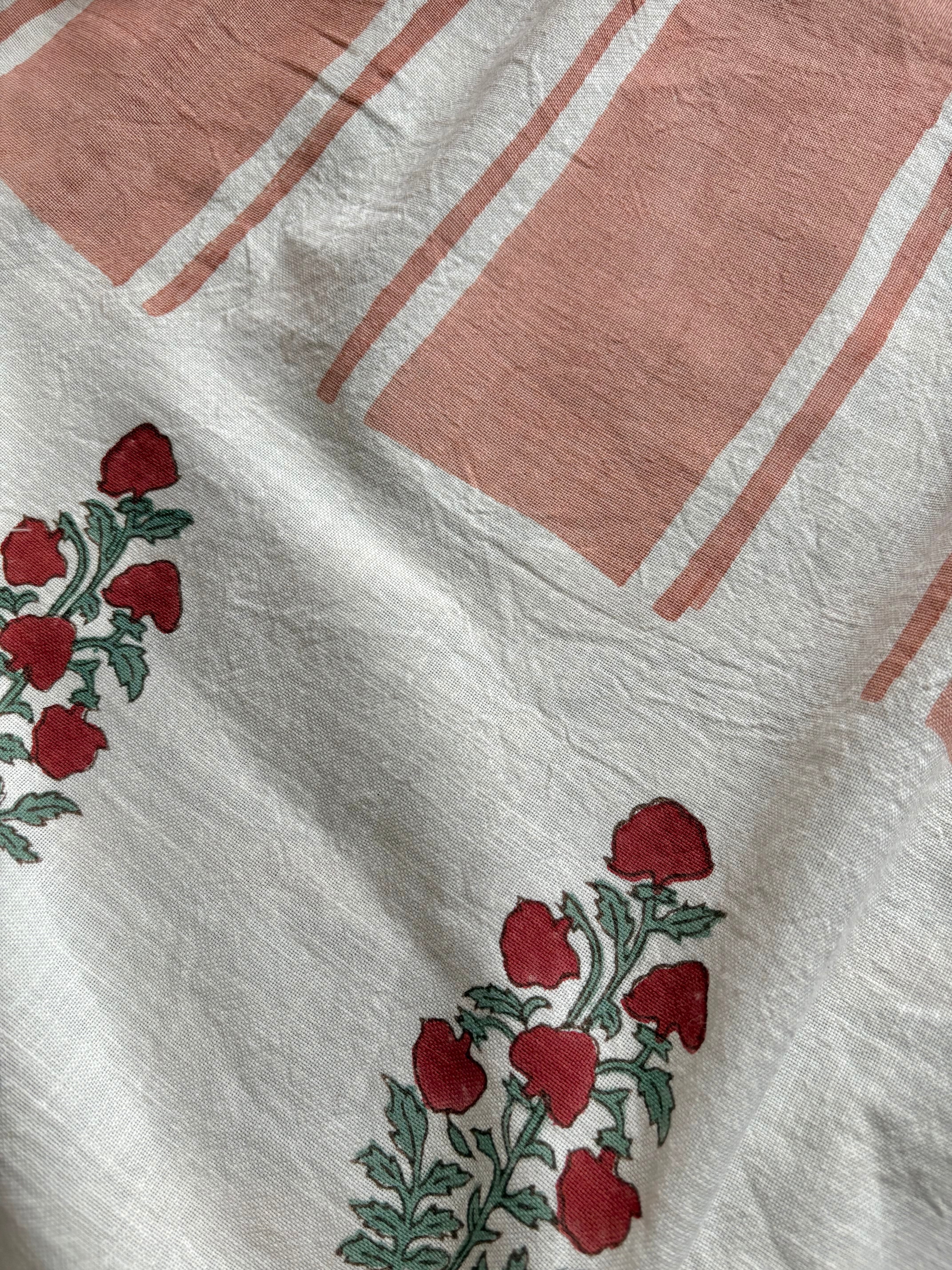 ●職人さんが木版を使い、ひと押しひと押し手染めしたブロックプリントは、色むらや柄のズレ、染料のハネ、時々小さなシミや汚れのようなものがございます。(最後の画像をご参照ください)